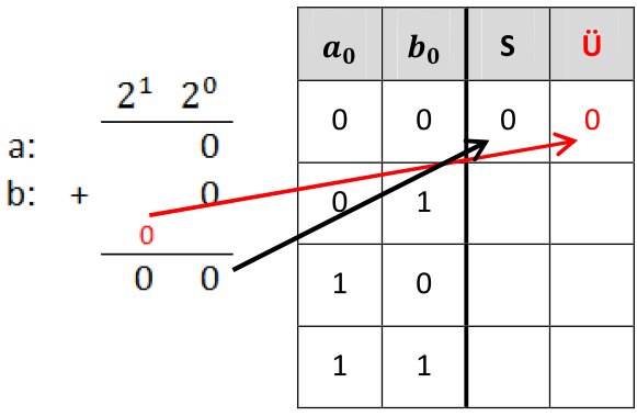 Zunächst addieren wir zwei Zahlen a0 und b0 der Länge 1 - also einstellige Zahlen. Beachte, dass neben der Summe S auch ein Übertrag Ü entstehen kann.