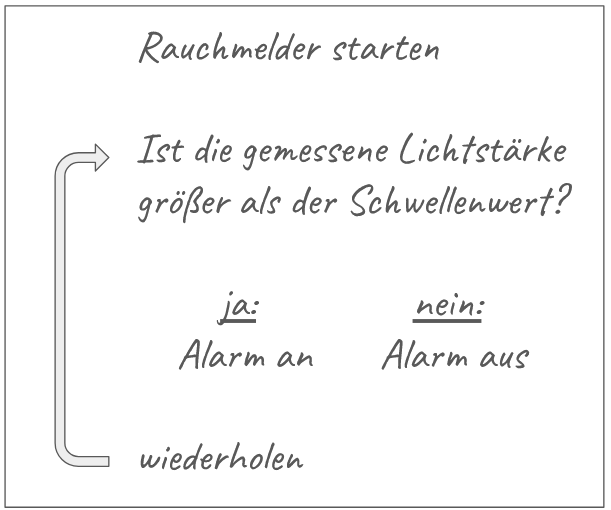 Im Folgenden wollen wir uns eine Handlungsvorschrift überlegen, die festlegt, in welcher Abfolge welche Aktionen zur Steuerung des Rauchmelders durchgeführt werden müssen. Eine solche Handlungsvorschrift bezeichnen wir in der Informatik als Algorithmus . Ein Algorithmus kann auf unterschiedliche Weisen dargestellt werden, z.B. als Flussdiagramm .