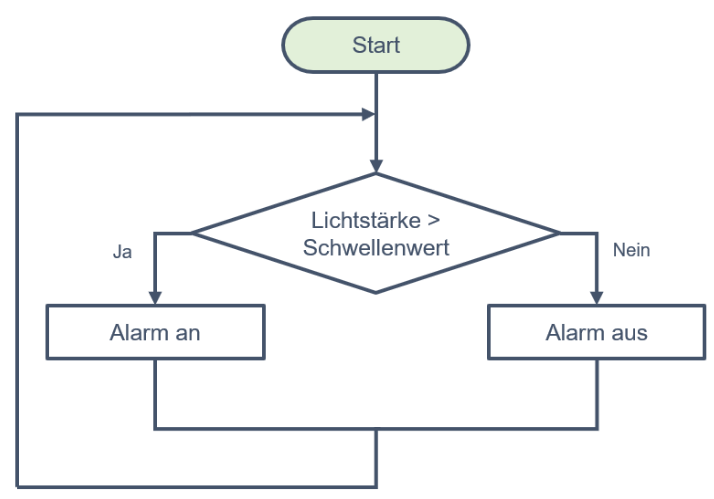 Die Schritte zum Steuern des Rauchmelders sind eigentlich recht simpel: Nachdem der Rauchmelder gestartet ist, muss die Lichtstärke, die der Lichtsensor misst, mit einem sogenannten Schwellenwert verglichen werden. Der Schwellenwert muss so gewählt werden, dass die gemessene Lichtstärke im Normalzustand des Rauchmelders unterhalb dieser Schwelle liegt, im Aktionszustand (d.h. sobald Rauch in den Rauchmelder eingedrungen ist) aber oberhalb dieser Schwelle liegt.