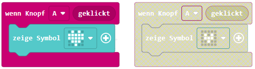 In dem Bild siehst du, dass der zweite Block ausgegraut ist, tausche dich kurz mit deinem Nachbar oder deiner Nachbarin aus und erklärt, warum dieser Block die Regeln der Programmiersprache MakeCode verletzt.