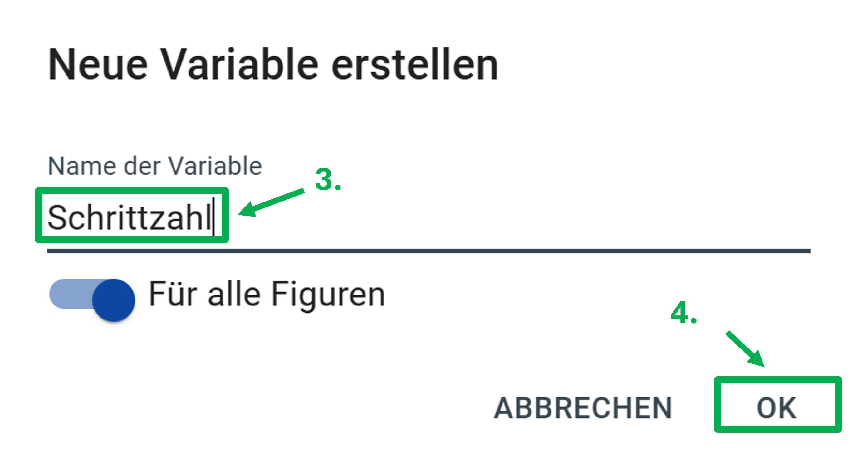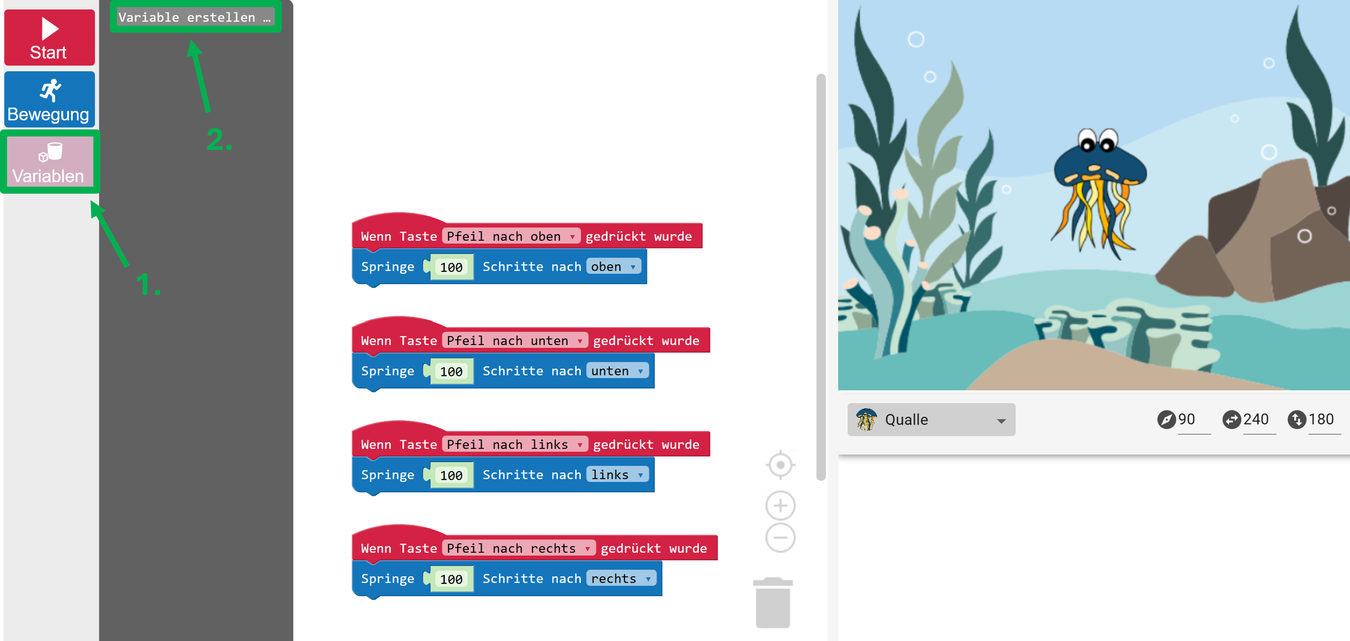 4.4 Variablen - Variablen erstellen Cubi: Tiefsee tauchen Variablen programmieren Variablen in Cubi Variablen in Cubi setzen Variablen in Cubi ändern Variablen auswerten Cubi: Qualle programmieren Abschluss-Quiz Das hast du gelernt Variablen programmieren Aufgabe 4 Ordne die Bausteine den Beschreibungen zu. Aufgabe 5 Erstelle im Cubi-Editor eine neue Variable, die du Schrittzahl nennst. Hier siehst du, wie das geht. Jetzt bist du dran! ←Zurück Weiter→