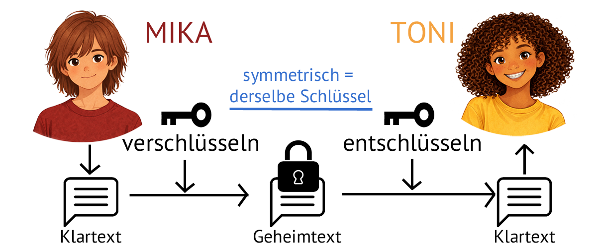 Das Verfahren ist symmetrisch, weil Sender und Empfänger denselben Schlüssel benutzen.